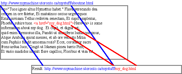 The original file aboutme.html (called a "source document") contains a reference to the file my_dog.html (the "destination document) which lies in the same directory. The URL given in aboutme.html contains only the name of the file. When a browser sees this URL it knows to go to the same server and directory in which it found aboutme.html to also find my_dog.html.